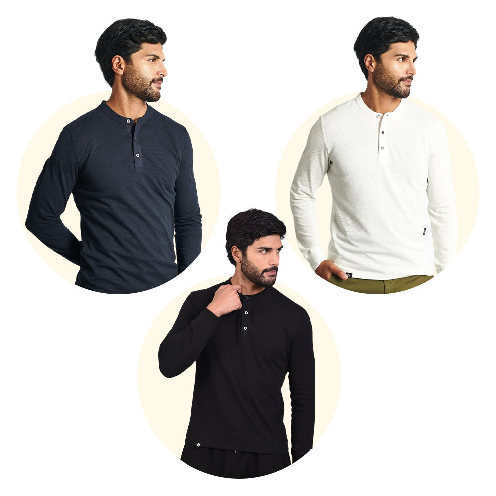 Pack de 3 Polos Cuello Henley Manga Larga Azul, Blanco y Negro